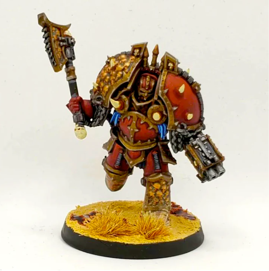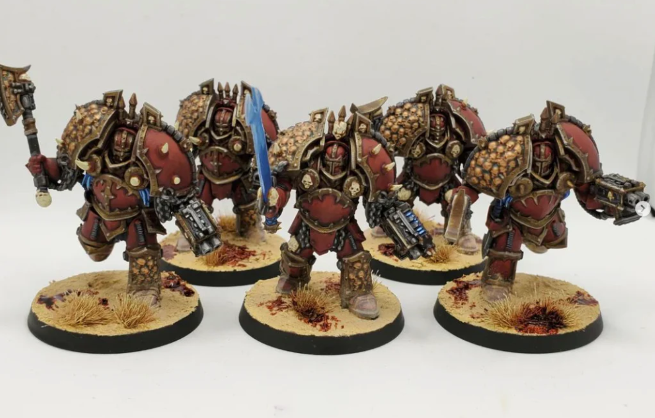 The Blood Butcher Terminators are veterans of a millennium of war, and their ancient, blood-soaked, Saturnus-Pattern Armor has been gifted by the lord of skulls. They can be found on the battlefield as elite units or single champions reaping a harvest of skulls for the throne of their bloody patron
