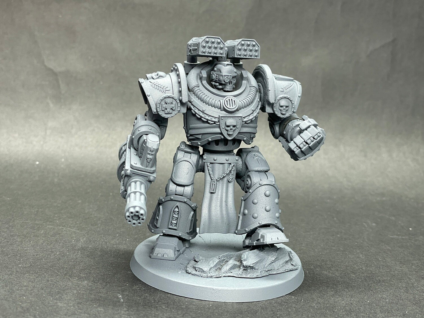 The Eternus Assault Armor is a Multipart kit designed for resin printers. Fully assembled it stands 7cm tall (about 3-1/2") and is a comparable size to a Contemptor Dreadnought. It can be assembled in a wide range of poses with many weapons and customization options including double weapon load-outs (sold separately). Its arms and weapons come pre-drilled for magnets to make them interchangeable for future-proofing your miniature.